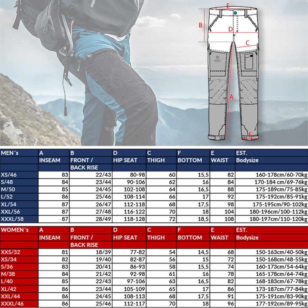 The hiking pants are reinforced at the adjustable waist and lower legs for better durability and fit. The zipped ventilation points on the outside of the thighs and lower legs allow you to easily control your body temperature during warmer climates or higher-pulse activities. Button and zip adjustments on the lower legs make it easy to fit the pants over your hiking boots.